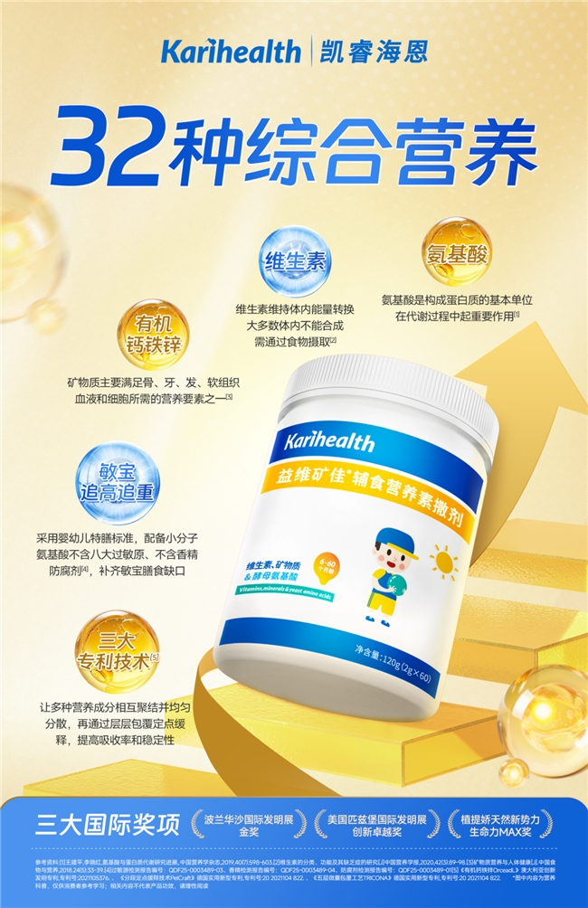 凯睿海恩旗下婴童大单品益维矿佳,小小一袋里就浓缩了32种综合营养,包含了氨基酸、维生素、矿物质三大类关键营养。其特有的三大专利技术[1],能够将营养素转化为小分子形态,避免了传统补剂的肠胃负担,更易被身体吸收,且它不含香精、防腐剂以及七大常见过敏源[2],很适合敏宝的娇嫩肠胃体质。