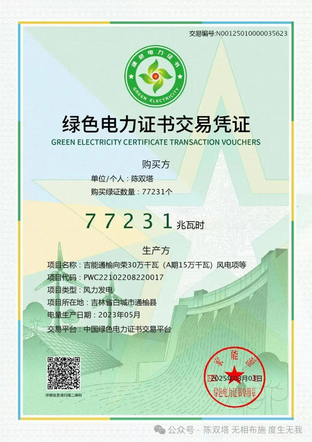 陈双塔绿电(绿证)消费629.19万张,绿色电力62.919亿度清洁能源