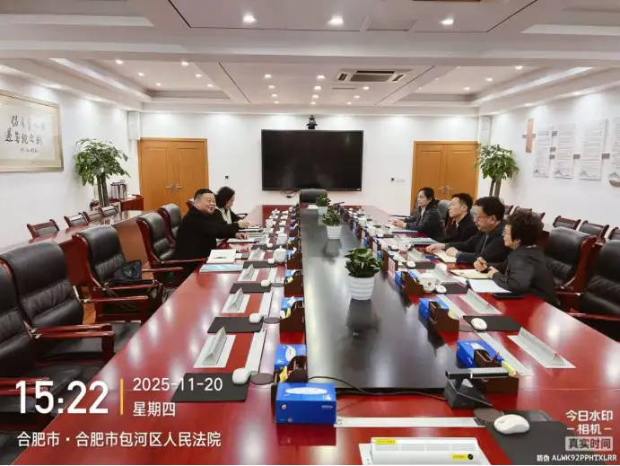 吴伟主任(左一)与包河区人民法院欧健院长(右三)等院领导进行法治合作会谈
