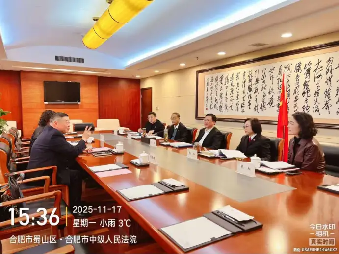 吴伟主任(左一)与合肥中级人民法院许徽院长(右中)等院领导进行法治合作会谈